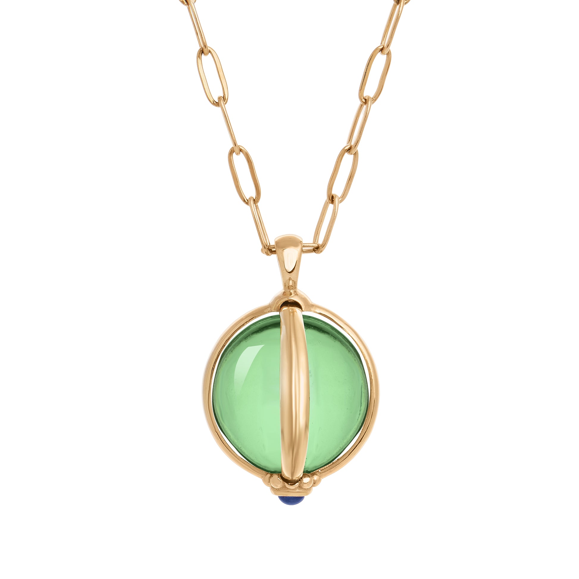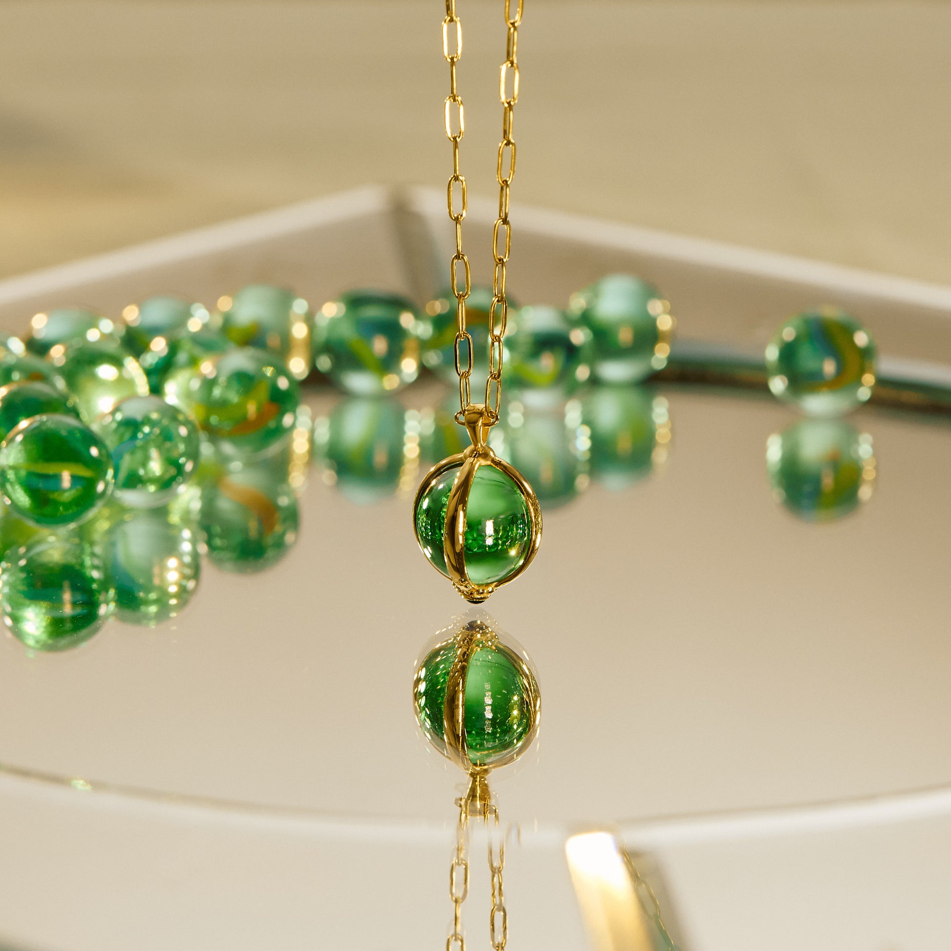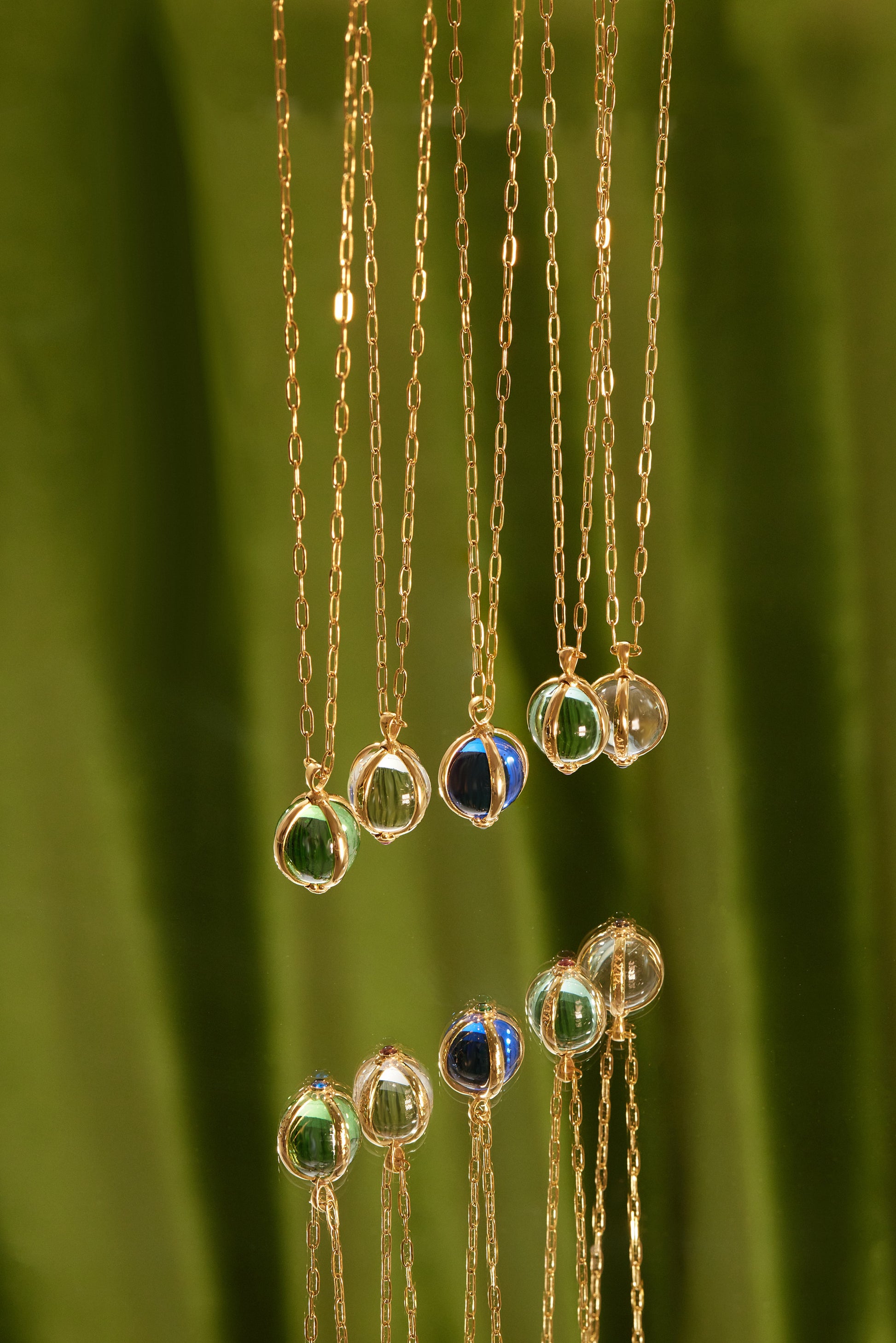 Material: Stainless steel chain, goldplated bronze sphere and glass bead