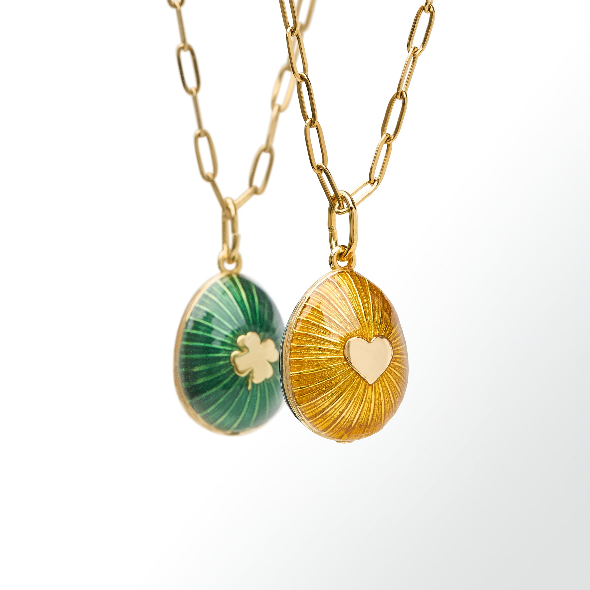 Egg pendant with a golden heart in yellow enamel in one side and a golden clover leaf in green enamel on the other side. Can be worn in both ways.