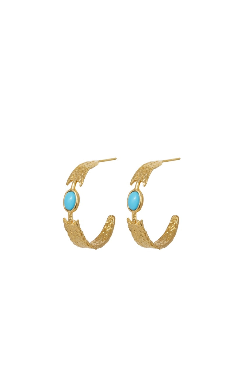 Goldplated metallic lace earrings with turquoise oval stone.