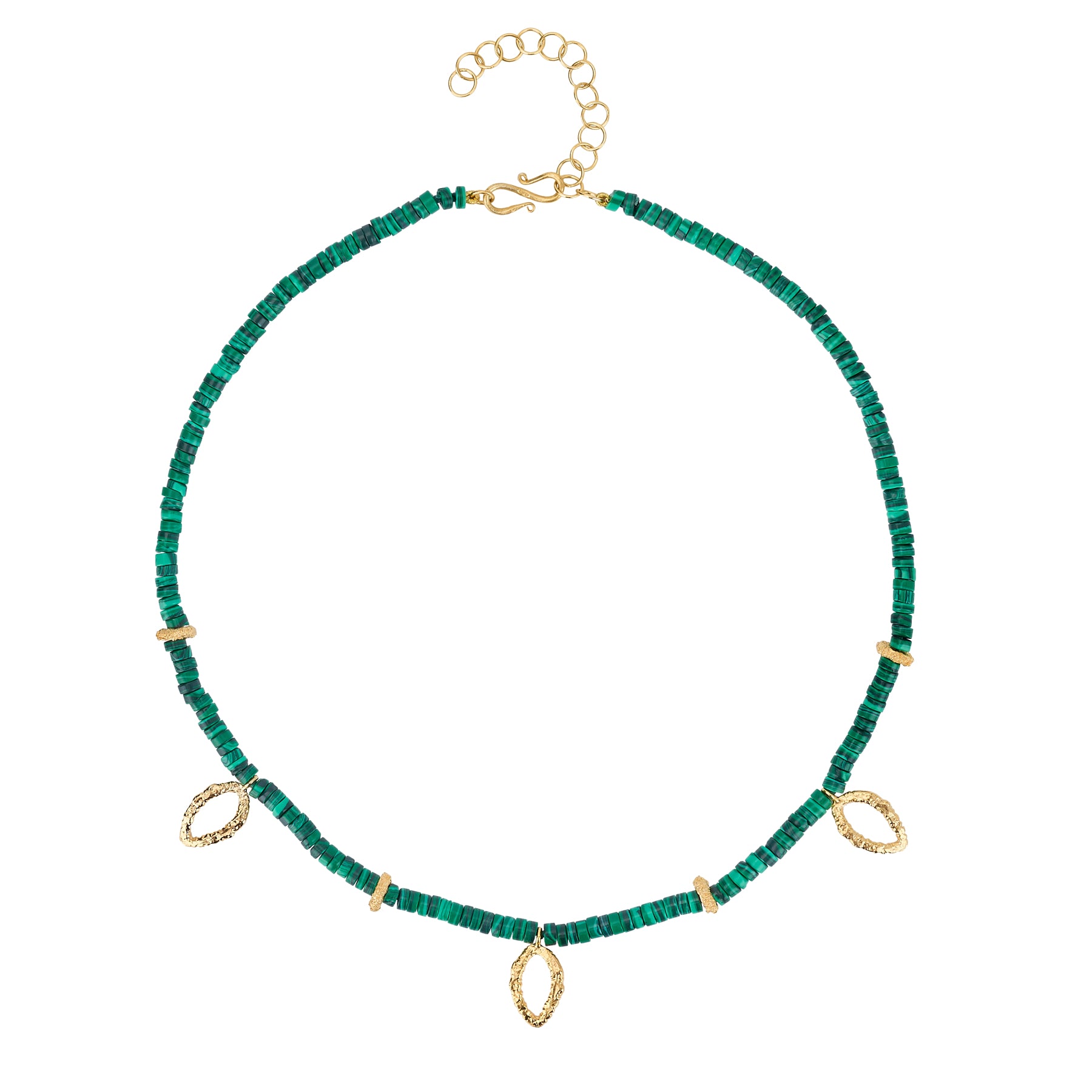 Mosi necklace in round malachite and goldplated metallic motifs.