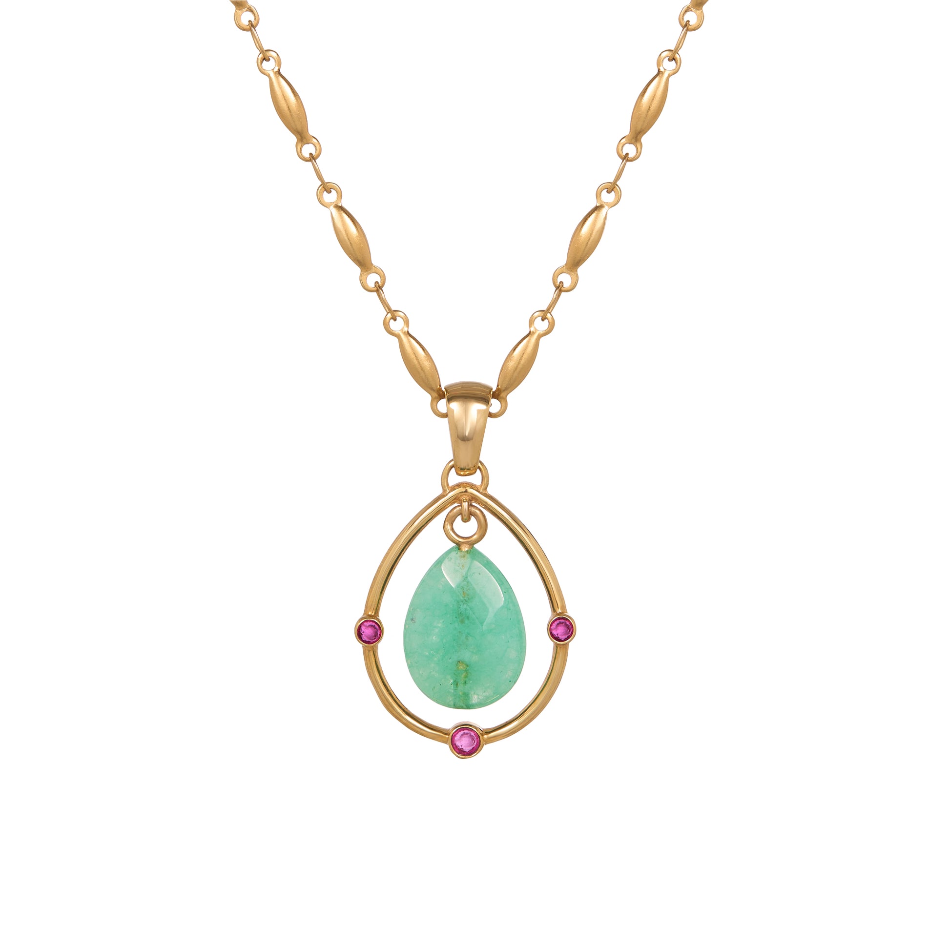 Vintage style egg pendant with ruby cubic zirconia and a pear shape chrysoprase stone in the centre